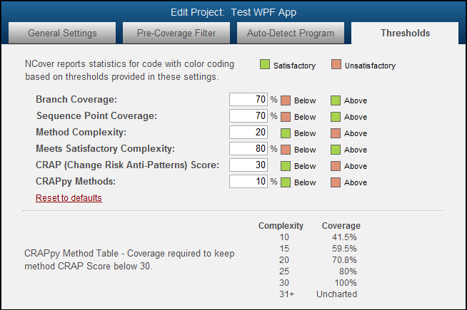 NCover reports coverage statistics with color coding based on the thresholds provided in these settings, which are set with some reasonable default values when you create a project. You can reset these values at any time from the Project Home view by by clicking and then clicking Reset to defaults on the thresholds tab.