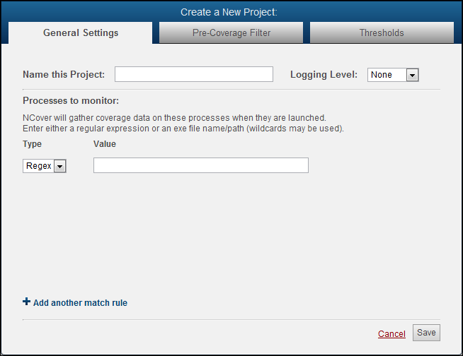 From the "General Settings" tab, view the name of the project and the regex or file path to specify the executable that will be covered on the local machine where the Collector is installed.