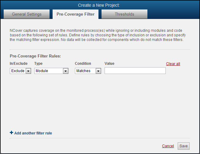The Code Central admin can include or exclude attributes, assemblies, files, methods, and types at runtime by using regular expressions, as specified in the Filter Rules of the Pre-Coverage Filter tab.