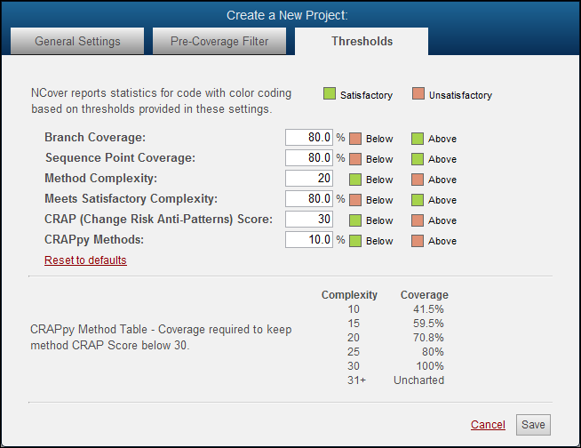 Code Central reports coverage statistics with color coding based on the thresholds provided in these settings, which are set with some reasonable default values when you create a project.