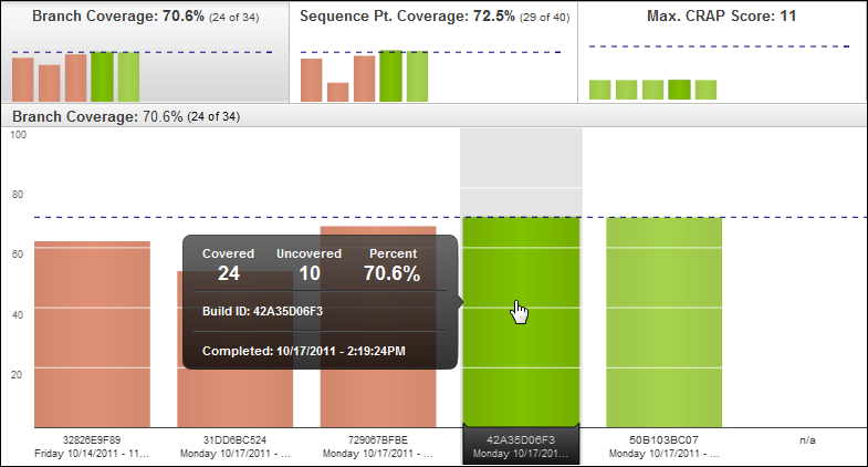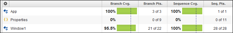 For reports like Branch Coverage, the header displays a percentage of coverage for the selected Execution, with the number of branches that were tested out of the total -- for example, 70.6% (24 of 34).