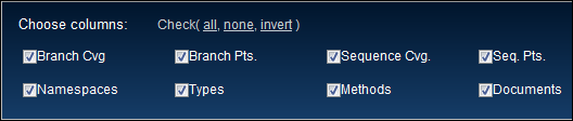 You can choose which code coverage columns are displayed in the Coverage Navigator by clicking in the upper-left corner of the panel. The selections you make here are applied globally, but can be modified at any time, from any level of data.