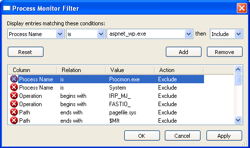 - Tell "Process Monitor" to only show events from the covered process by setting up the options as show in the screenshot below and clicking the "Add" button. The process name should match the name of the covered process. In the screenshot below, the process name matches the ASP.NET worker process name for IIS 5. If you're troubleshooting a problem in IIS 6 or 7, the ASP.NET worker process name is "w3wp.exe".