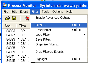 Switch to "Process Monitor" and stop collecting events by pressing "CTRL + E" on your keyboard, or by selecting "File -> Capture Events" from the menu. Next, filter the list so that it only shows events from the covered process. You can do this by selecting "Filter -> Filter ..." from the menu (see the picture below).